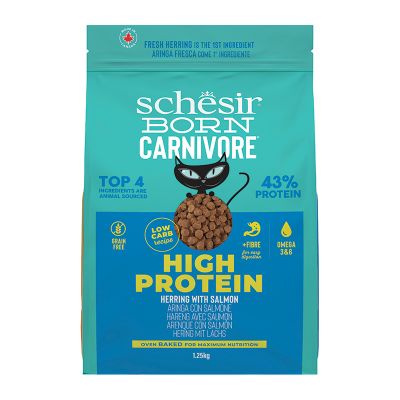 Πλήρης τροφή με ρέγγα και σολομό, χωρίς σιτηρά, για ενήλικες γάτες. Η τροφή αυτή αποτελείται από τραγανές κροκέτες που ψήνονται στο φούρνο, διατηρώντας την πλούσια περιεκτικότητα σε βιταμίνες και μέταλλα. Επιπλέον, παρασκευάζεται με φρέσκο ψάρι και έχει χαμηλή περιεκτικότητα σε υδατάνθρακες, ενώ είναι πλούσια σε φυτικές ίνες για τη διευκόλυνση της πέψης. Περιέχει ακόμη έλαιο σολομού, πλούσιο σε Ωμέγα λιπαρά οξέα, για την υγεία του δέρματος και του τριχώματος.